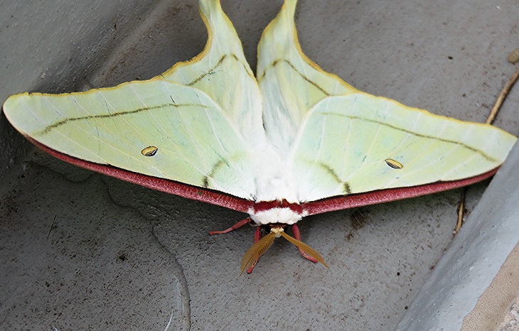 主人公はベランダの床の一段下がった細い縁(排水の部分)でジッとしてます。久しぶりです。大型の美しい蛾で、今回が私としては3回目の”出逢い”です。指を近づけたら、”前ヒゲ”を左右に広げました。生きているのです!翅は実にキャベツの葉そっくりです。遠くからでは生きものだとは思えません。私も最初見た時は「何でこんな所にキャベツの葉っぱがあるんだろう」と思ったほどでしたから。