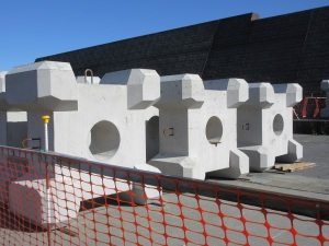 作業の合間に作業員さんに聞いたところ、白田川で使う工事用のものだということでした。帰宅して調べたら、ほぼ同じような格好をしたコンクリートブロックが川床の表面に平らに幾つも寝かせている写真を見つけました。名称はコンクリートストーンブロック(護床根固ブロック)と書いてありました。川床を固めるための防護措置ということでしょう。使用されているのは海ではなく、川だったのです。このブロックが横に寝かせてあったら、即座に稲生沢川や白田川で使われている(?)のをイメージ出来たと思いますがね。ちなみにウェブサイトでは、コンクリートではなく、モルタルを流し込んだものということでした。