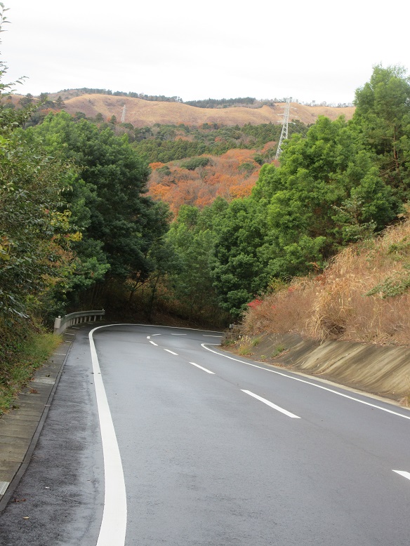 緩やかな坂を上った所で振り返ります。いつの間にか右手に多少の広場が出来ました。多分残土か、何かの仮置き場なのでしょう。この柚久保道入口近くに置かれたコンクリートブロックのような物など。以前、河津~下田間の高速道建設で出る排出土をどこにするかという話がありましたから、こうした道路脇を利用するのもありということでしょうか。